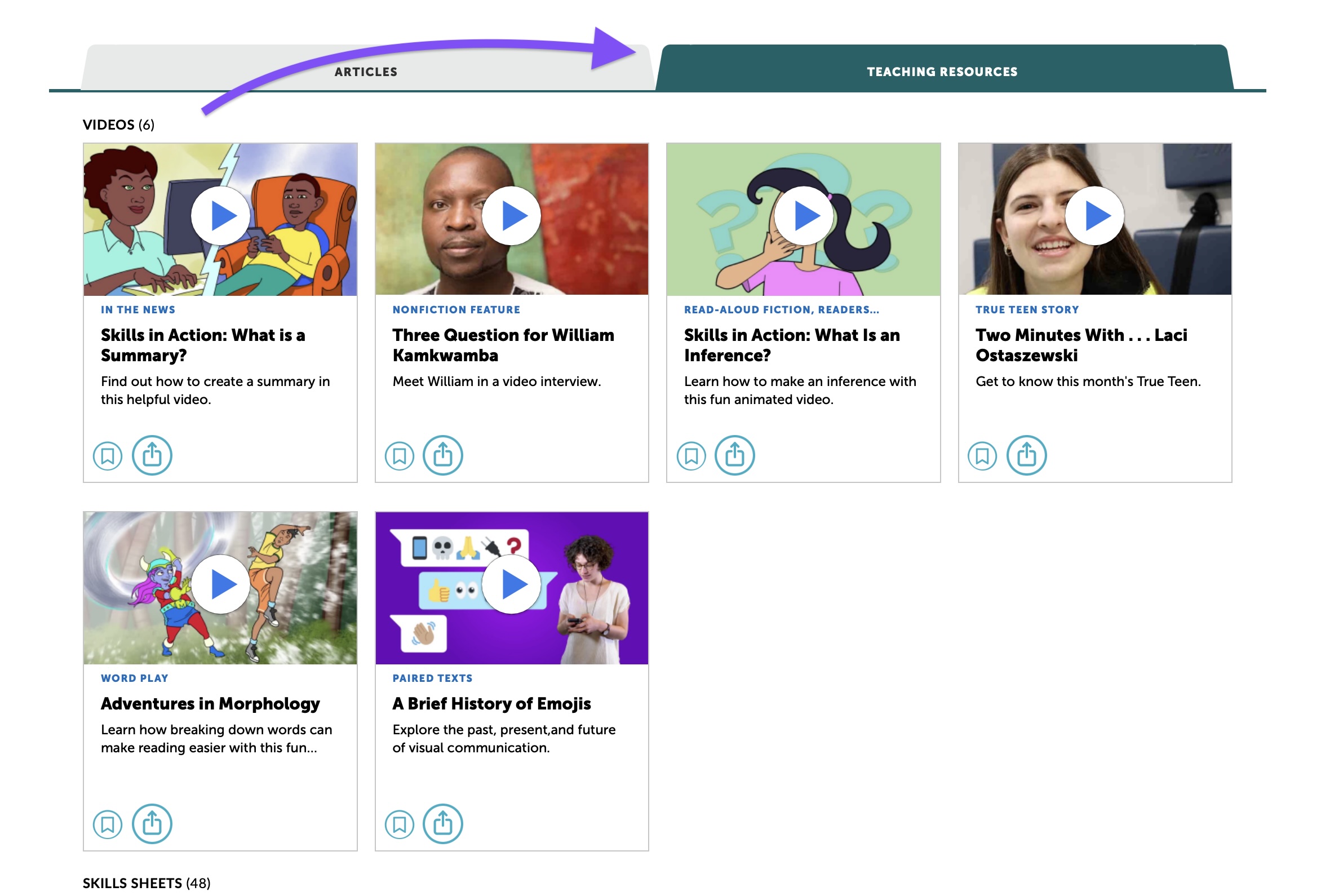 Scroll down and you’ll see all the articles in this issue, along with their associated resources, like videos, Slide Decks, skill builders, and Lesson Plans.