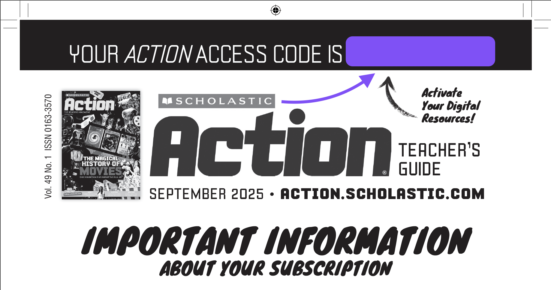 To activate your Action Digital subscription, you'll need your access code. This unique 8-character code can be found on the first page of the Teacher's Guide that is packaged with your issues.
