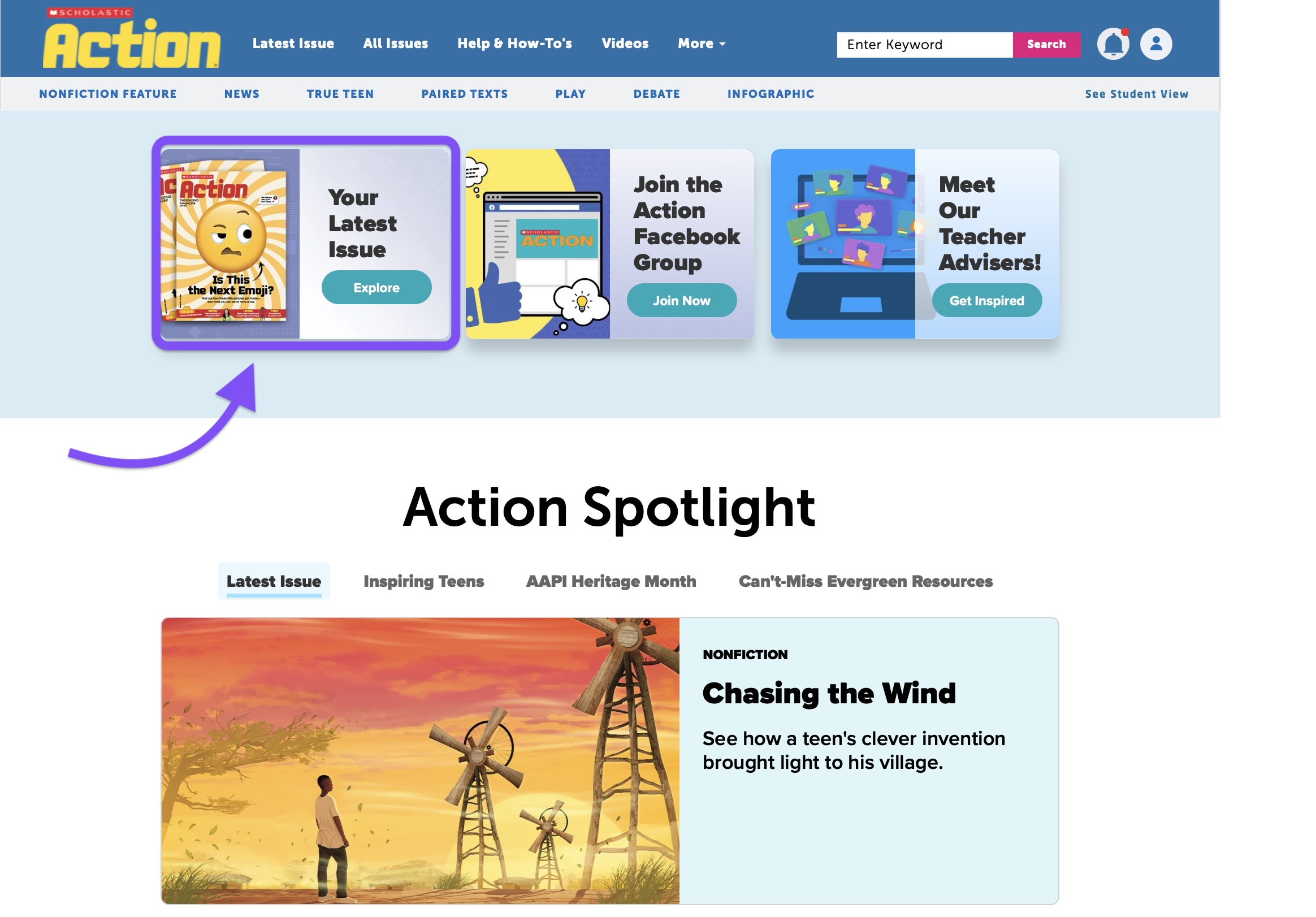 When you log in, you’ll come to your teacher homepage. Your latest issue will always be at the top of the page, just one click away: